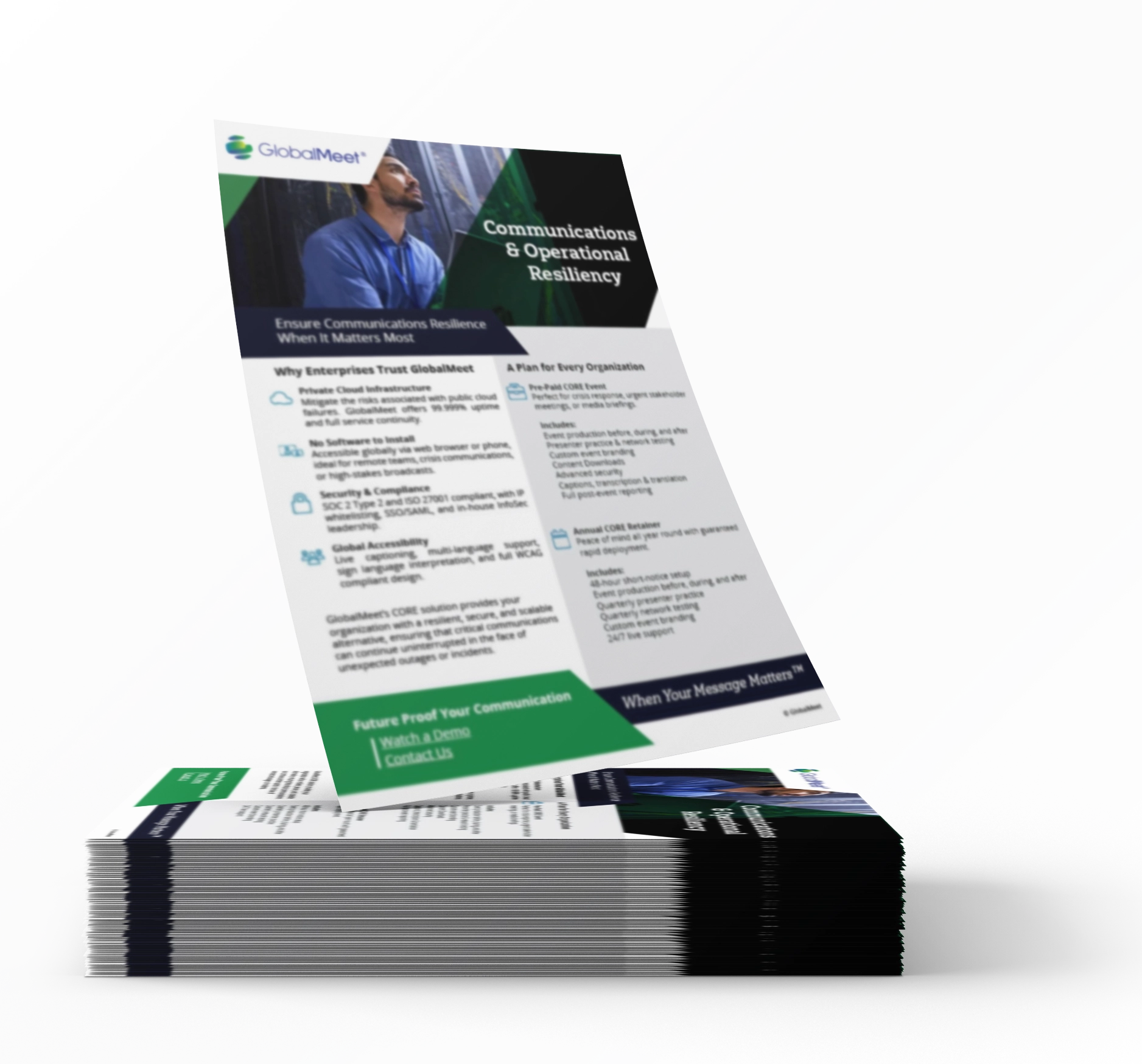 Ensure communications resilience when it matters most, and maintain secure, scalable, uninterrupted coverage during outages or crises with the GlobalMeet CORE Solution.