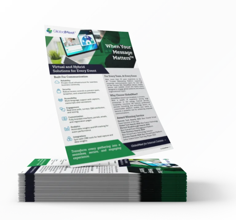 Learn how GlobalMeet's virtual and hybrid corporate communications solutions can help you transform every gathering into a seamless, secure, and engaging experience. For every team, at every event.