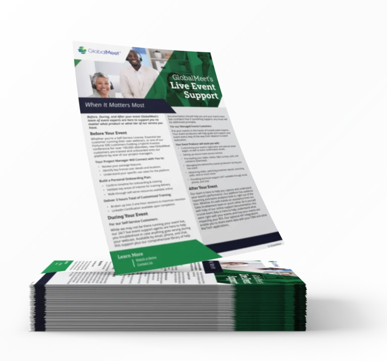 Before, During, and After your event GlobalMeet’s team of event experts are here to support you no matter what product or what tier of our service you have.